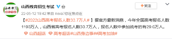据官方最新消息,今年全国高考报名人数1193万人,山西省高考报名人数33.7万人,报名人数中参加统考的有29.6万人。来源:@山西教育招生考试 微博