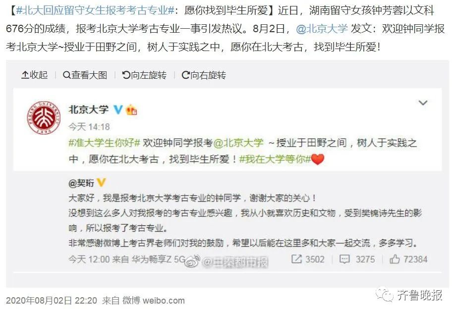 2020年,“湖南留守女生钟芳蓉以文科676分的成绩报考北大考古专业”一事,引发关注,北大也曾专门发文回应:“愿你在北大考古,找到毕生所爱”。