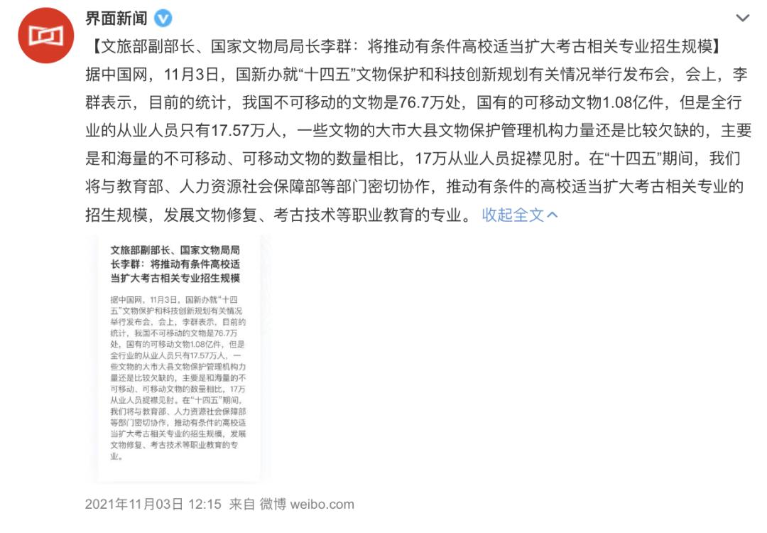 2021年11月3日,中国文化和旅游部副部长、国家文物局局长李群表示,将推动有条件的高校适当扩大考古相关专业的招生规模,发展文物修复、考古技术等职业教育的专业。