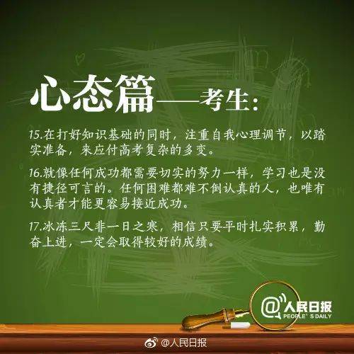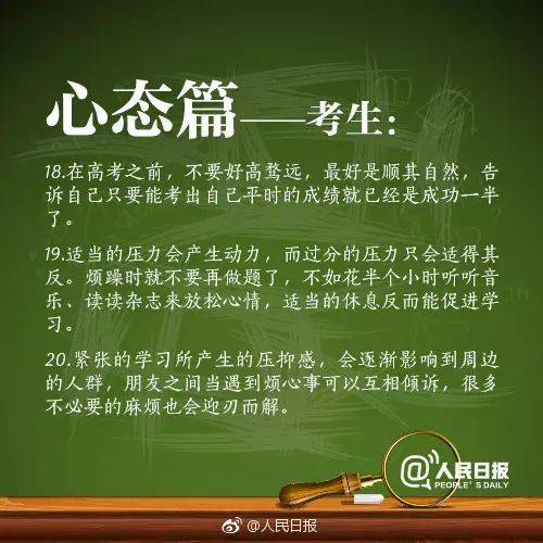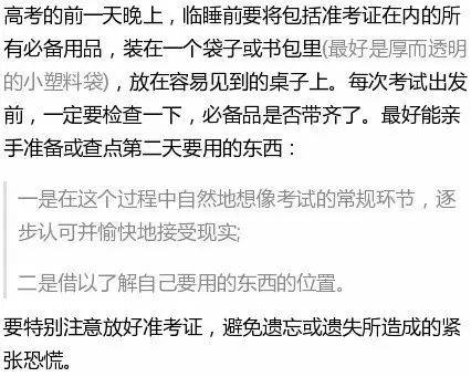 父母说了这句话自己感觉有定心丸,自己肯定会尽力的,这样减少了不少心理压力,就会从容地应对高考。但也有些家长高考前唠唠叨叨,反复嘱咐孩子,考试要认真,不要马虎,一分之差,千人之后,你一定要改变马虎的习惯,现在可不能丢分了,你可要注意呀。其实,这样的话家长已经讲了多少遍,在高考前再讲、反复地讲会增加孩子的心理压力。高考前,孩子和父母发生口角对情绪的稳定会起很大的破坏作用,这对考试的影响是不能低估的。