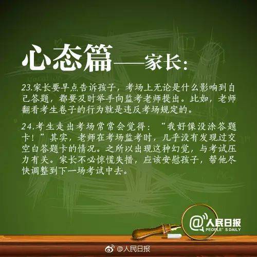 在高考前,特别是孩子在家备考期间,家长要摆脱各种外界的干扰,经常保持比较平和的心态,这对孩子能以稳定的情绪、平和的心态去对待考试是很有意义的。高考前,家长也会对高考的各种动态有所反应,但是,要冷静对待,要有分析地对待,更不能把一些小道消息随便传给孩子。