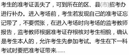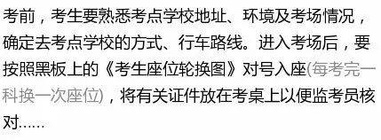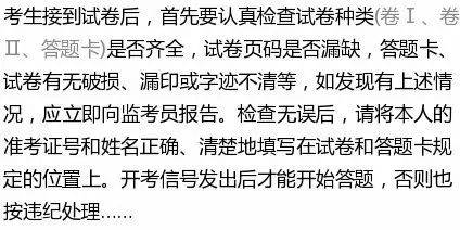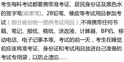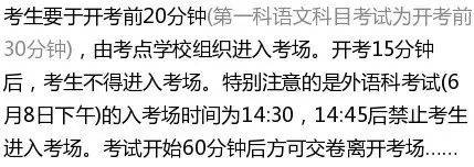 参加语文、数学、综合能力测试、物理、生物、历史、化学、政治、地理及高职类语文、数学、英语等12科考试的考生,一定要在开考前20分钟开始进入试室,正式考试开始15分钟后禁止迟到考生进入试室。