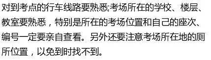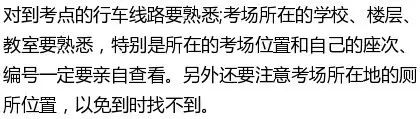 要出行小心,交通安全。要注意选择适当的交通工具,尽量不要乘坐摩托车,步行过路口要遵守交通规则。要充分估计到交通堵塞等意外情况,适当提前出发以免耽误考试,避免因为赶时间而引发交通事故。