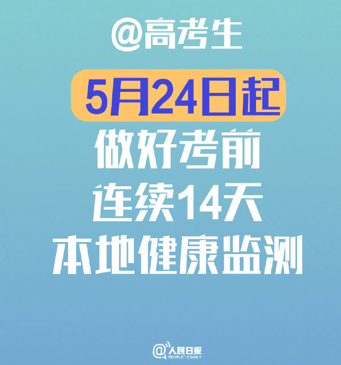 最新提醒!高考生明天起做好14天健康监测!全国多地高考将于6月7日、8日举行。请各位考生全面了解并严格遵守考点所在地考试防疫要求,做好考前连续14天本地健康监测,减少不必要的聚集和跨区域流动、不到人群流动性较大场所、不前往中高风险等级地区等。