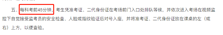 江西省《2022年普通高考考场规则》要求“每科考前45分钟,考生凭准考证、二代身份证在考场前门入口处排队等候。”
