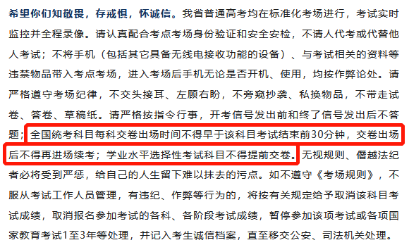 西藏教育考试院在《致我区高考考生及家长的一封信》中提到:每科目考试结束前30分钟才能交卷出场。每位考生要合理安排答题时间。交卷离场后迅速离开考点考场,不得再进入考场,也不得在考点考场附近逗留或交谈。
