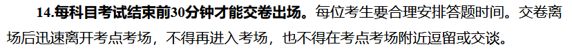 江西省2022年高考考场规则中提到:开考15分钟后(有听力考试的外语科目14∶45开始禁止考生进入考场)禁止考生进入考点参加当次科目考试,交卷出场时间原则上不得早于本场考试结束前30分钟,交卷出场后不得再进场续考,也不得在考场附近逗留或交谈。