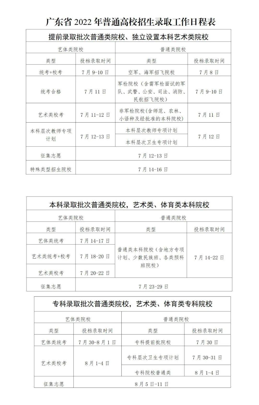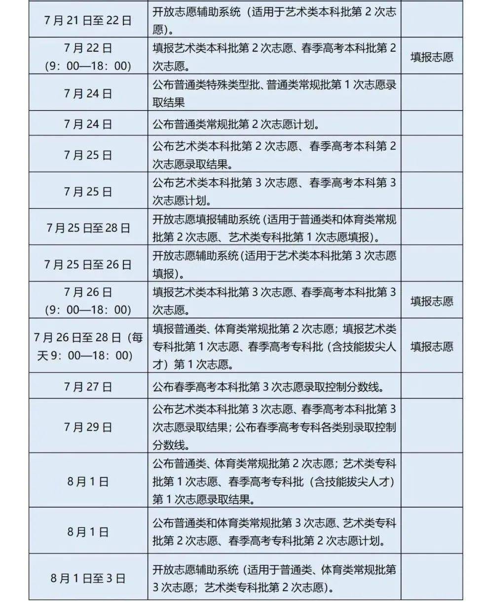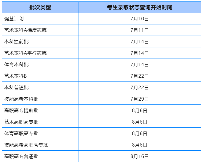 3.艺术类高职(专科)批院校录取:7月25日至8月1日。