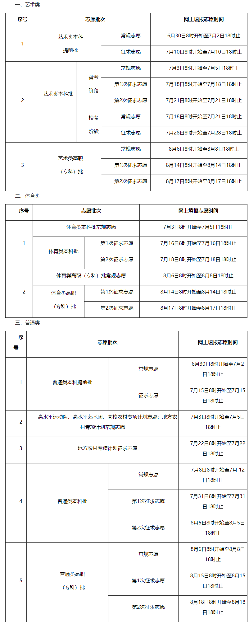 各批次征集志愿时间
