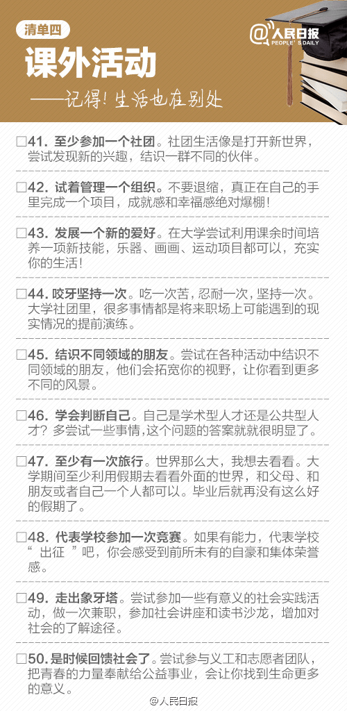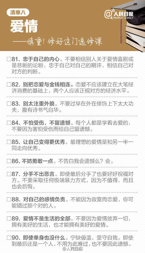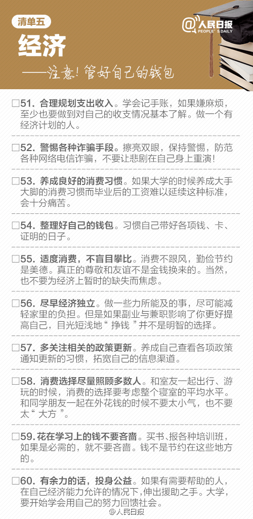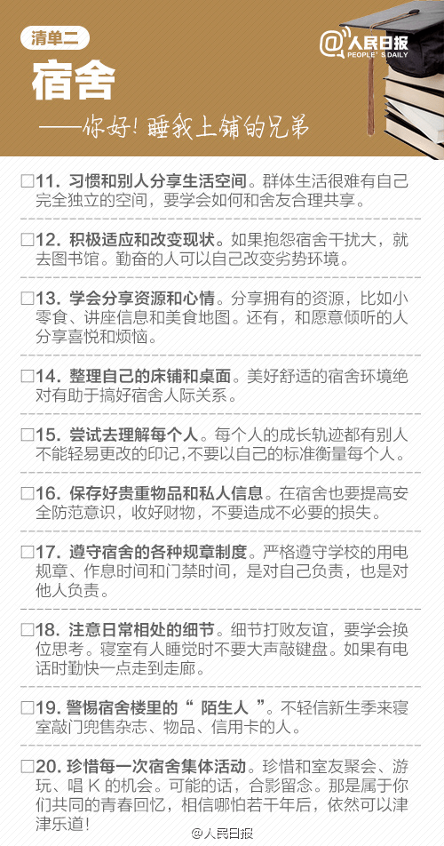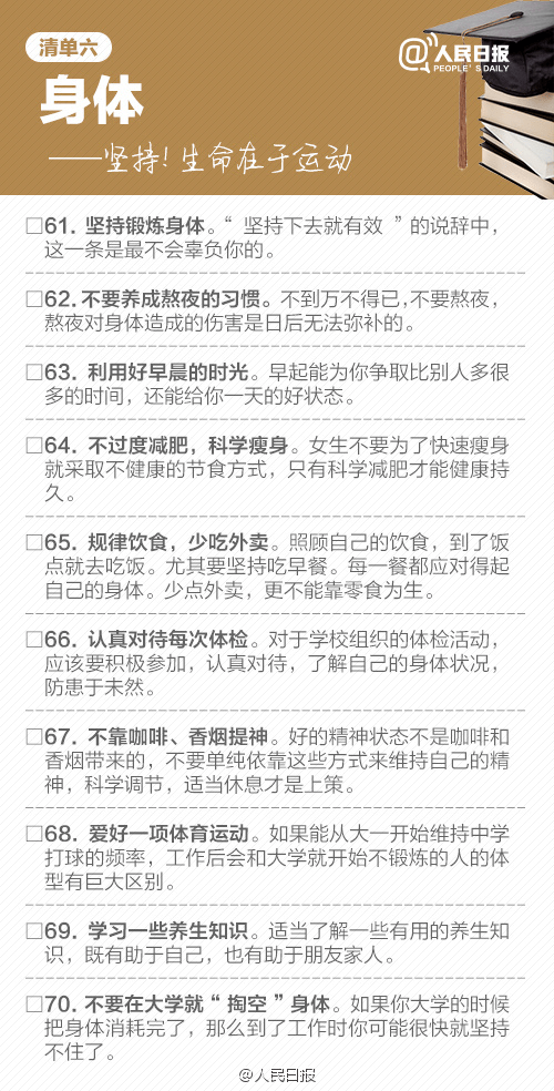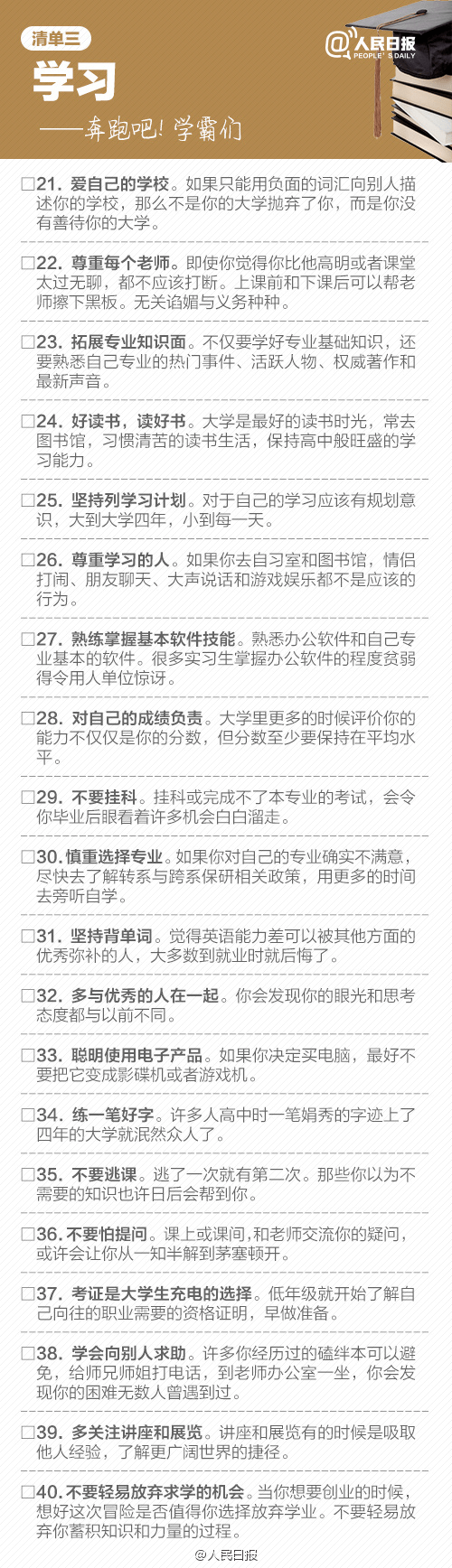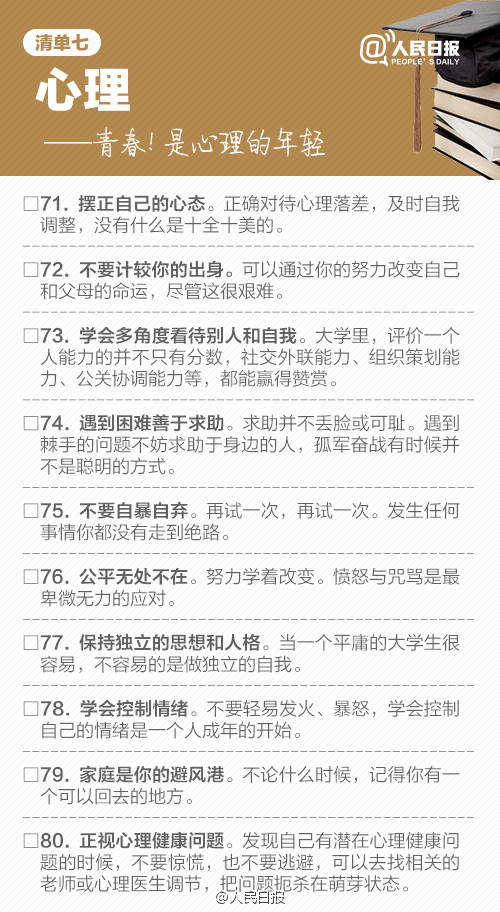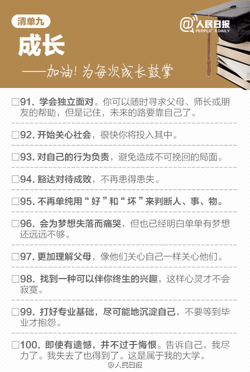 人民日报为大学新人在学业建设、身体和心理健康、个人成长等方面提供了100条忠告,对大一新生的学业生活和未来发展都将有非常大的帮助。
