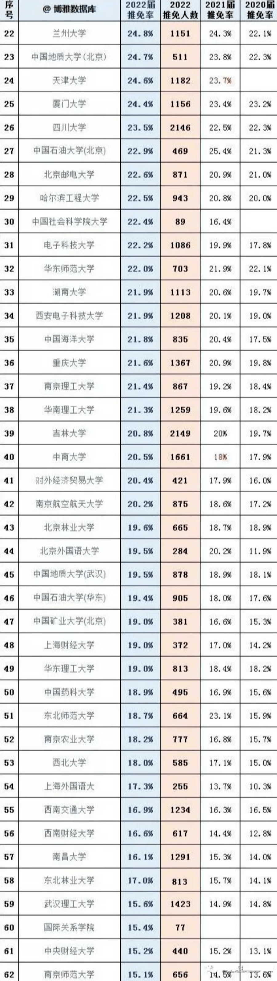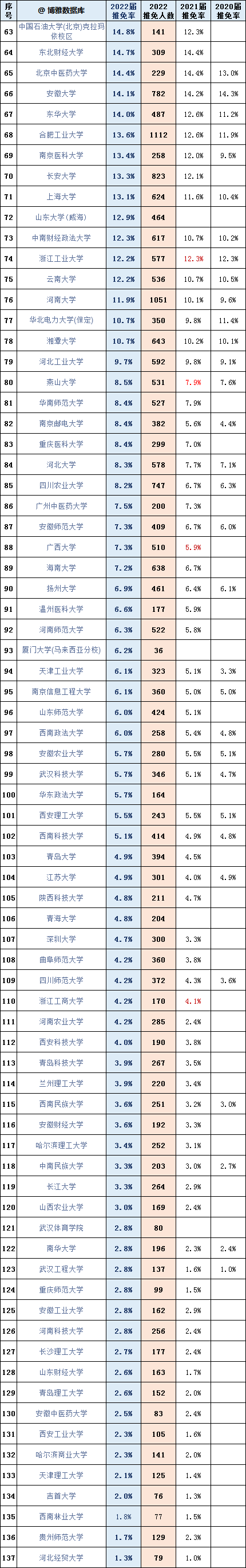 复旦、交大、兰大等拥有医学院的高校,本科生总数未去除医学长学制,实际推免比例可能更高。