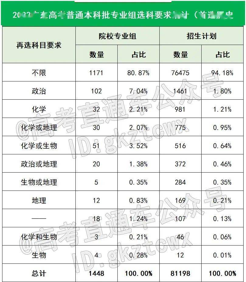 据统计,今年广东高考普通类本科批共有 1448 个历史类院校专业组,不限再选科目的专业组数量最多,有 1171 个,超 8 成院校专业组可供历史类考生自由选择。且这些自由可选的专业组共计划招生 76475 人,在总招生人数中占比 94.18%,也就是说,超 9 成历史本科生在录取中不受选科限制。