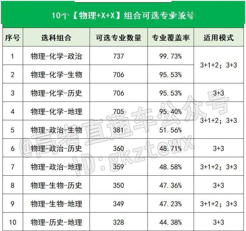 物理+化学+地理:专业覆盖面也较广,可报考专业门类多,理科、工科类的热门专业都可以报考,此外经济类、管理类、农学类、医学也在选择之列。