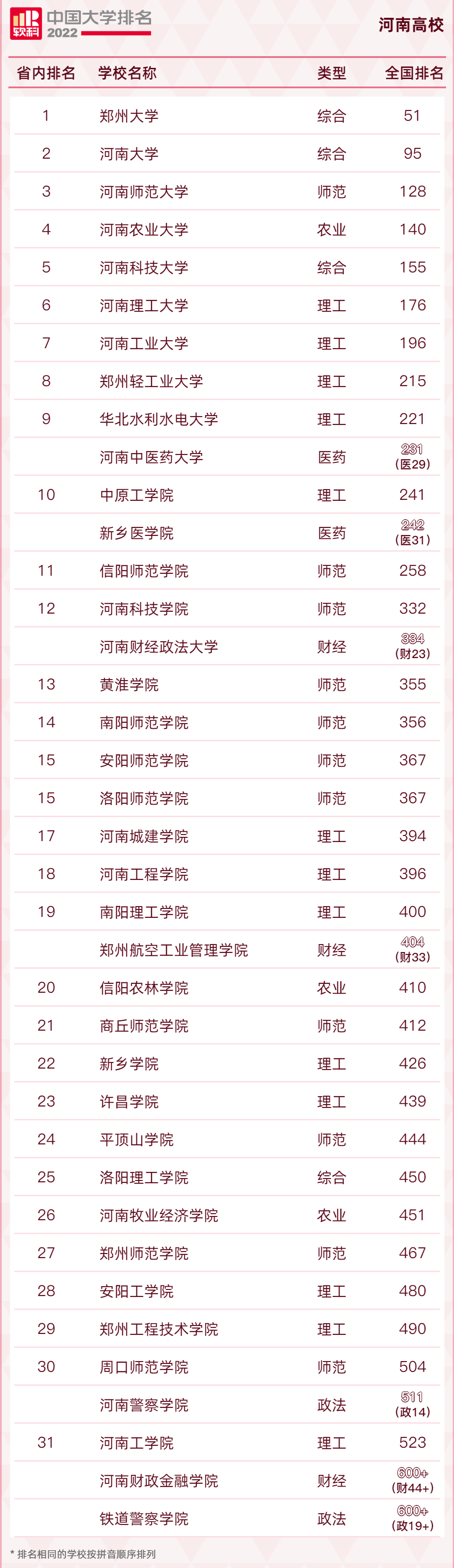 放眼全国,河南高校的整体实力并不具优势。在2022软科中国大学排名中,河南高校缺席全国50强,仅郑州大学(51名)、河南大学(95名)两所高校跻身全国百强。而同为人口大省的广东省、山东省的高校实力更为凸显。中山大学(12名)、华南理工大学(25名)、南方科技大学(35名)、暨南大学(47名)、山东大学(22名)等高校均进入了全国50强,领衔两地高等教育发展。