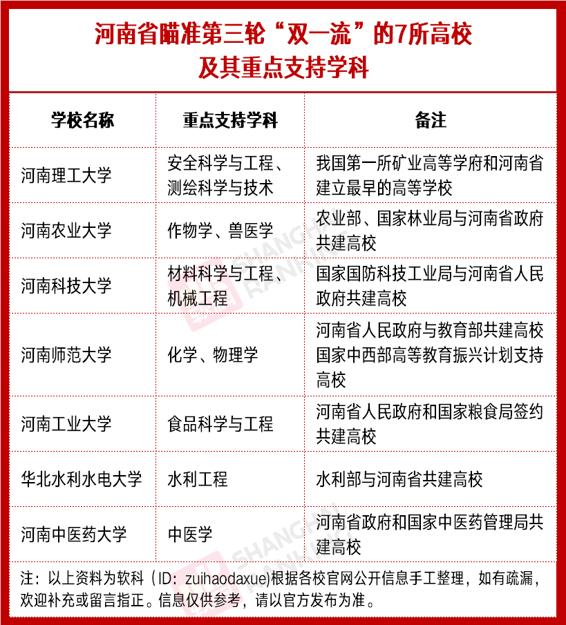 实际上,河南“双一流”建设版图正在扩大——去年,河南已遴选出河南科技大学、河南师范大学、河南农业大学、河南理工大学、河南工业大学、河南中医药大学、华北水利水电大学7所高校的11个学科作为“双一流”创建学科,砸重金投入55亿元创建资金,全力打造“双一流”后备军,力争2-3所高校、若干学科进入国家第三轮“双一流”建设行列。