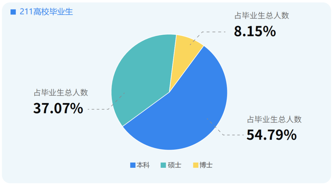在合并统计的211高校毕业生992044人中,本科毕业生占毕业生总人数的54.79%;硕士研究生占毕业生总人数的37.07%;博士研究生占毕业生总人数的8.15%。极高的学历层次结构是211高校毕业生源区别于普通高校毕业生源的最大结构特点。
