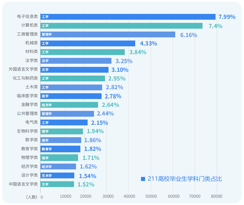 从学科维度来看,共有13个学科生源人数占比超过2%,其中,工学类学科占7个,主要包含材料类、电气类、电子信息类、化工与制药类、机械类、计算机类、土木类,人数在211高校总生源中占比达31.49%,是各大校园招聘企业人才竞争的主要目标群体。