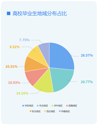 华东地区高校毕业生源合计居全国第一,高达26万人。其中江苏毕业生源为9万人,占生源总量的9.14%,毕业生源在华东地区居首位。