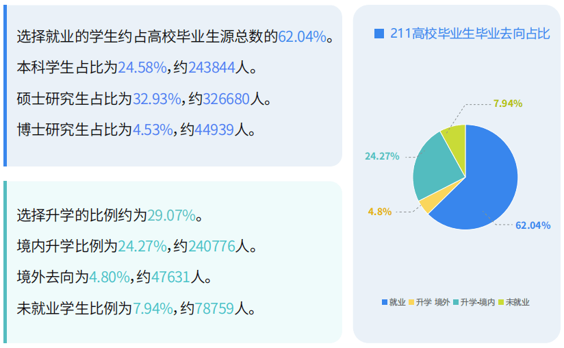 在2022年211高校毕业生中,选择就业的学生约占高校毕业生源总数的62.04%,选择升学的比例约为29.07%。