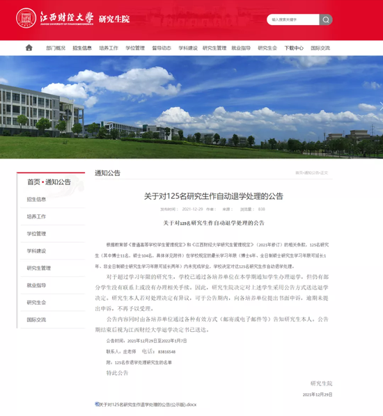 去年底,江西财经大学研究生院发布公告,对125名研究生作自动退学处理,原因是超过最长学习年限。其中博士11名,学制均为3年,10人的入学年份在2012年至2015年间,1人为2004年入学,距今已有18年时间。此外,作退学处理的研究生中,MBA学院人数最多,达到70人。