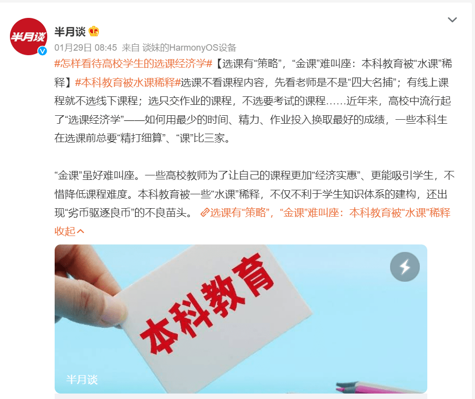 此前,《半月谈》就“本科教育被水课稀释”与“选课经济学”现象,评论道: