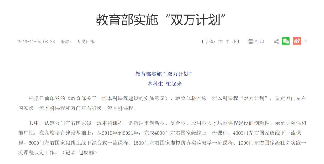 2019年4月,教育部印发 《教育部办公厅关于实施一流本科专业建设“双万计划”的通知》。同年10月,教育部启动一流课程建设“双万计划”,即“金课建设”计划。