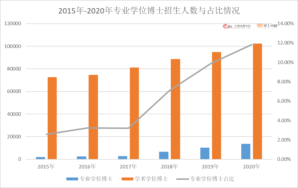 根据教育部公布数据,随着大力度推进专业学位博士研究生的培养,2021年专业学位博士招生比例已达到14.4%。