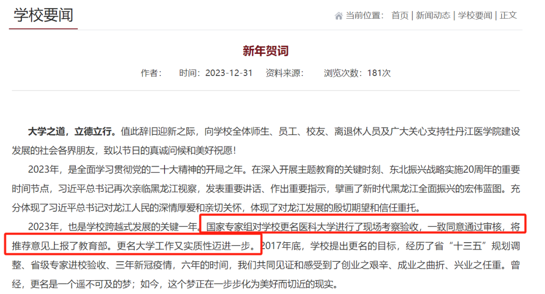 近日,牡丹江医学院发布新年贺词,其中提到,国家专家组对学校更名医科大学进行了现场考察验收,一致同意通过审核,将推荐意见上报了教育部,更名大学工作又实质性迈进一步。