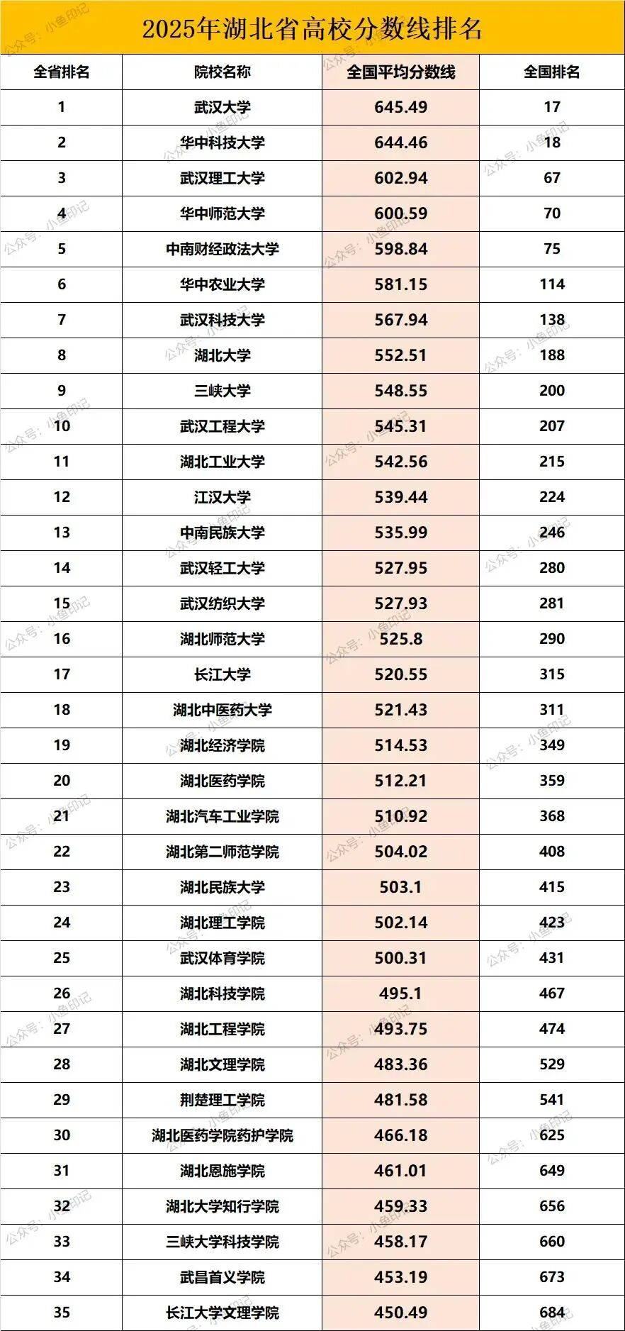 根据2025年全国各省公布的高校录取分数线,今天我们可以看看湖北省高校的录取分数线排名情况。本次排名以物理类全国平均分数线为标准,具体情况如下。