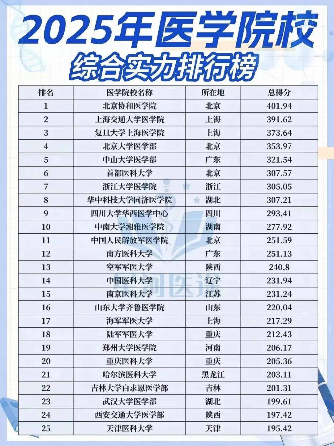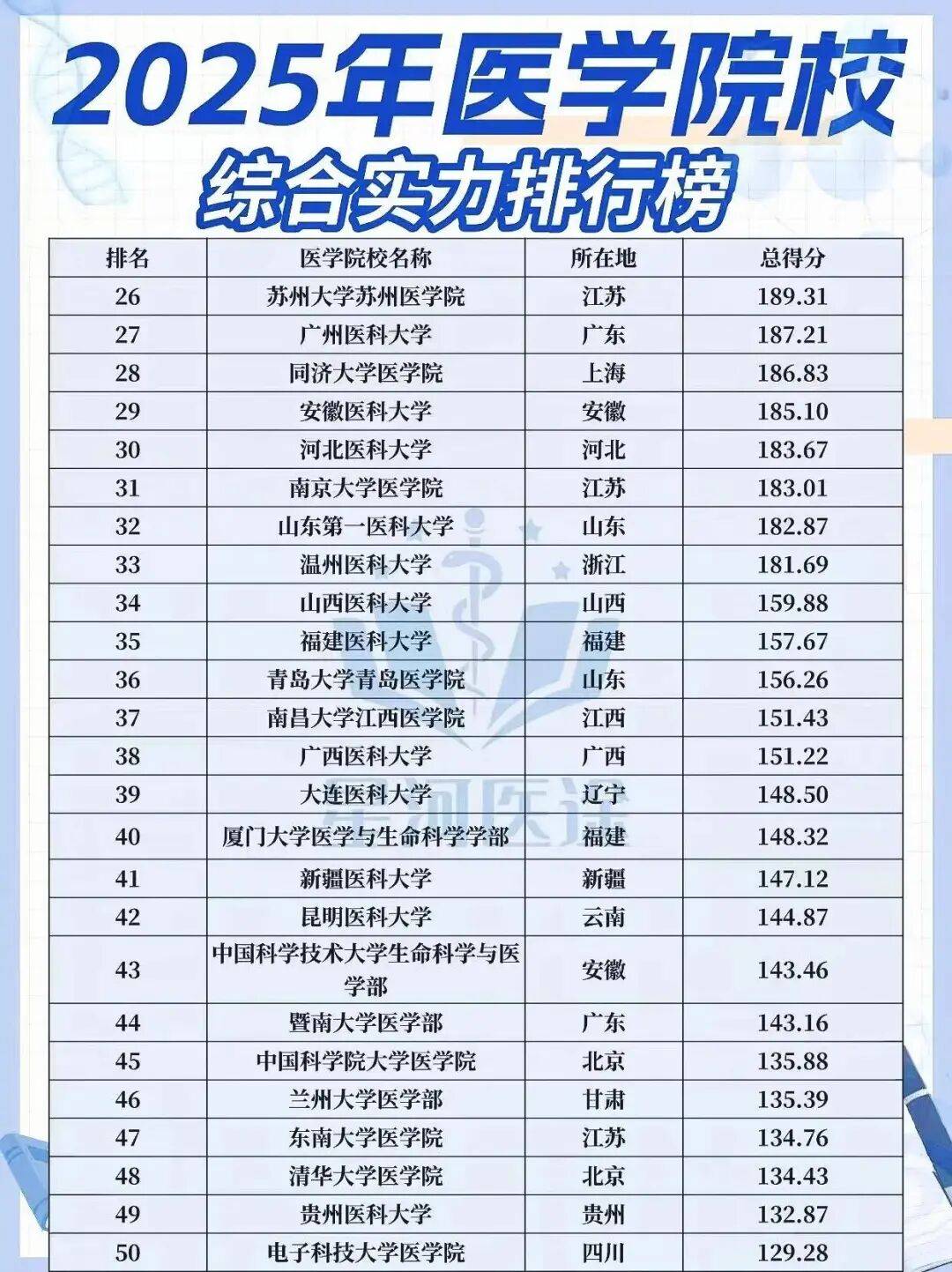本次排名包括有综合性高校医学院和独立医科大学,相对来说排名还是极为全面,也有较大的参考价值。