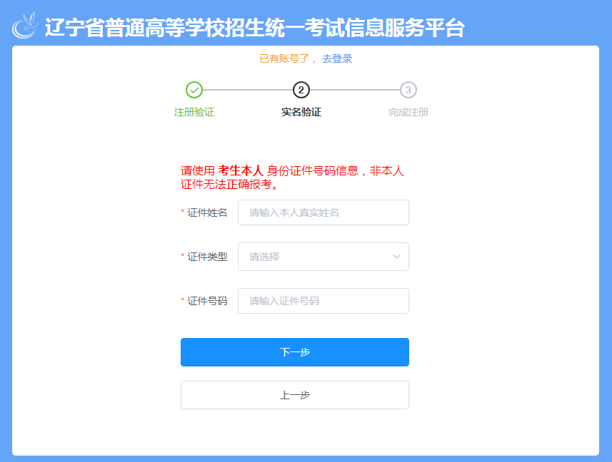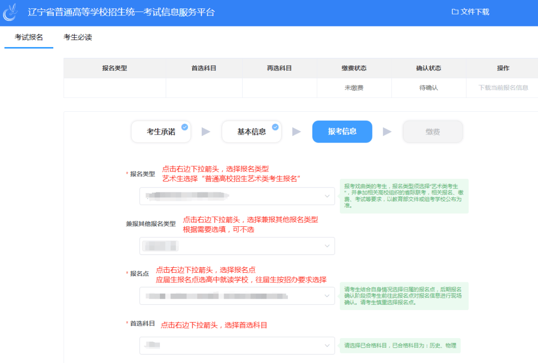 进入报考信息界面,带※为必选项目,考生正确选择和输入报考类型、兼报其他报考类型、报名点、首选科目、再选科目、残疾证件号码、民族语言卷和外语语种内容。信息输入完成后,点击“下一步”跳转到报考信息页面,系统自动判断考生是否提交毕业类别信息,如提交则直接获取报名点,无需考生人工选择。