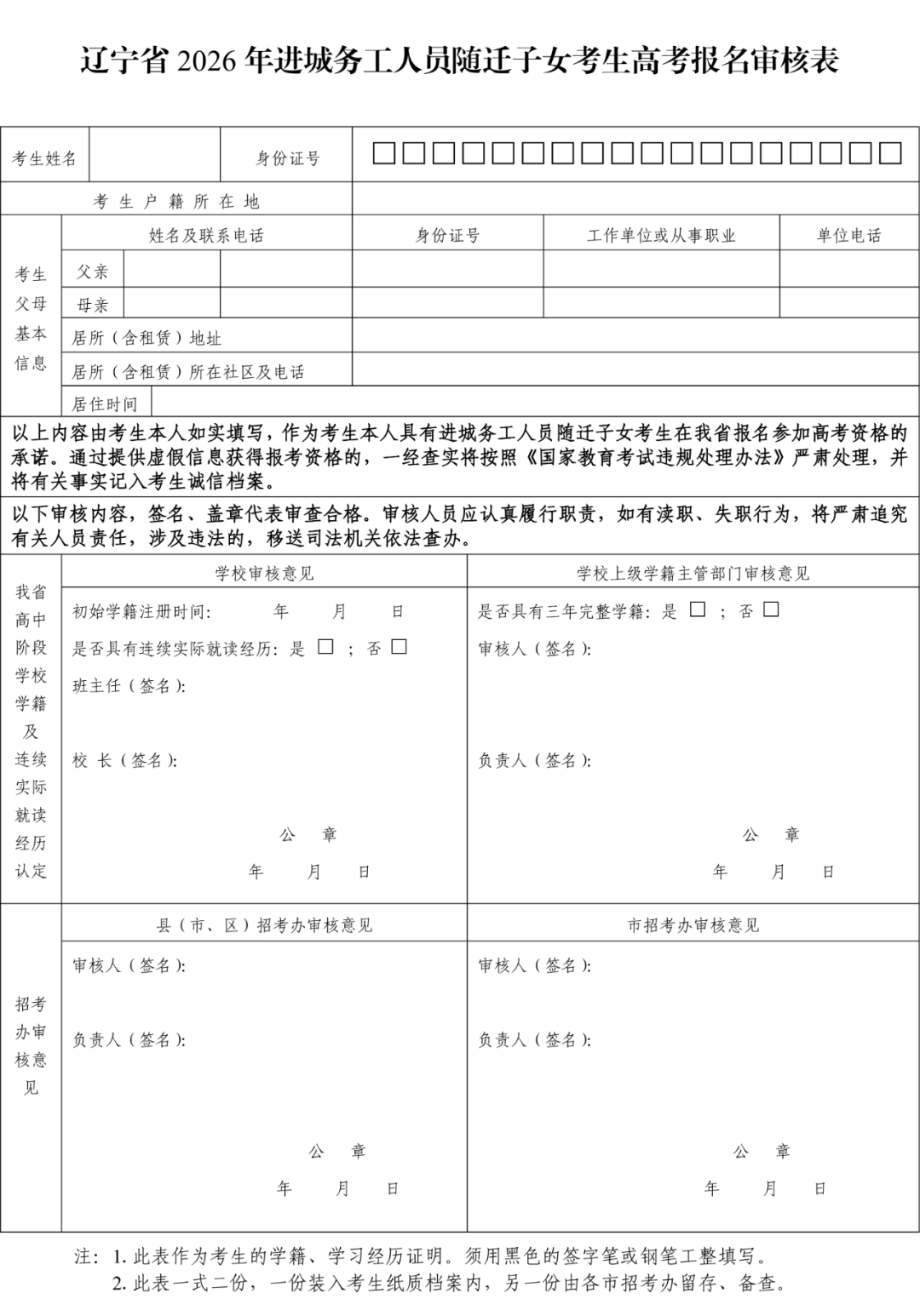 随迁子女考生报名须提供:本人填写经有关学校、学校上级学籍主管部门确认的《随迁子女考生审核表》,表格形式如下: