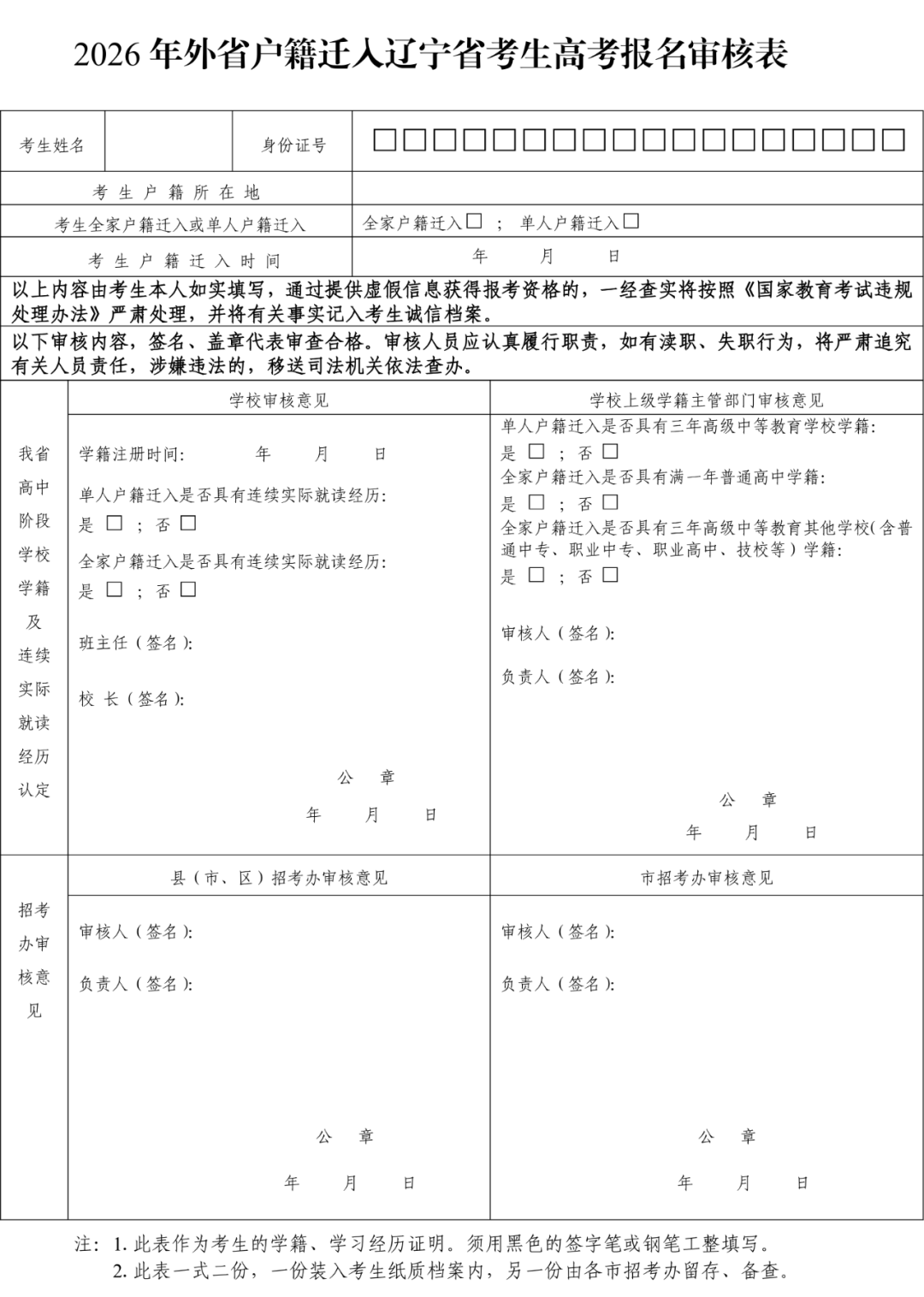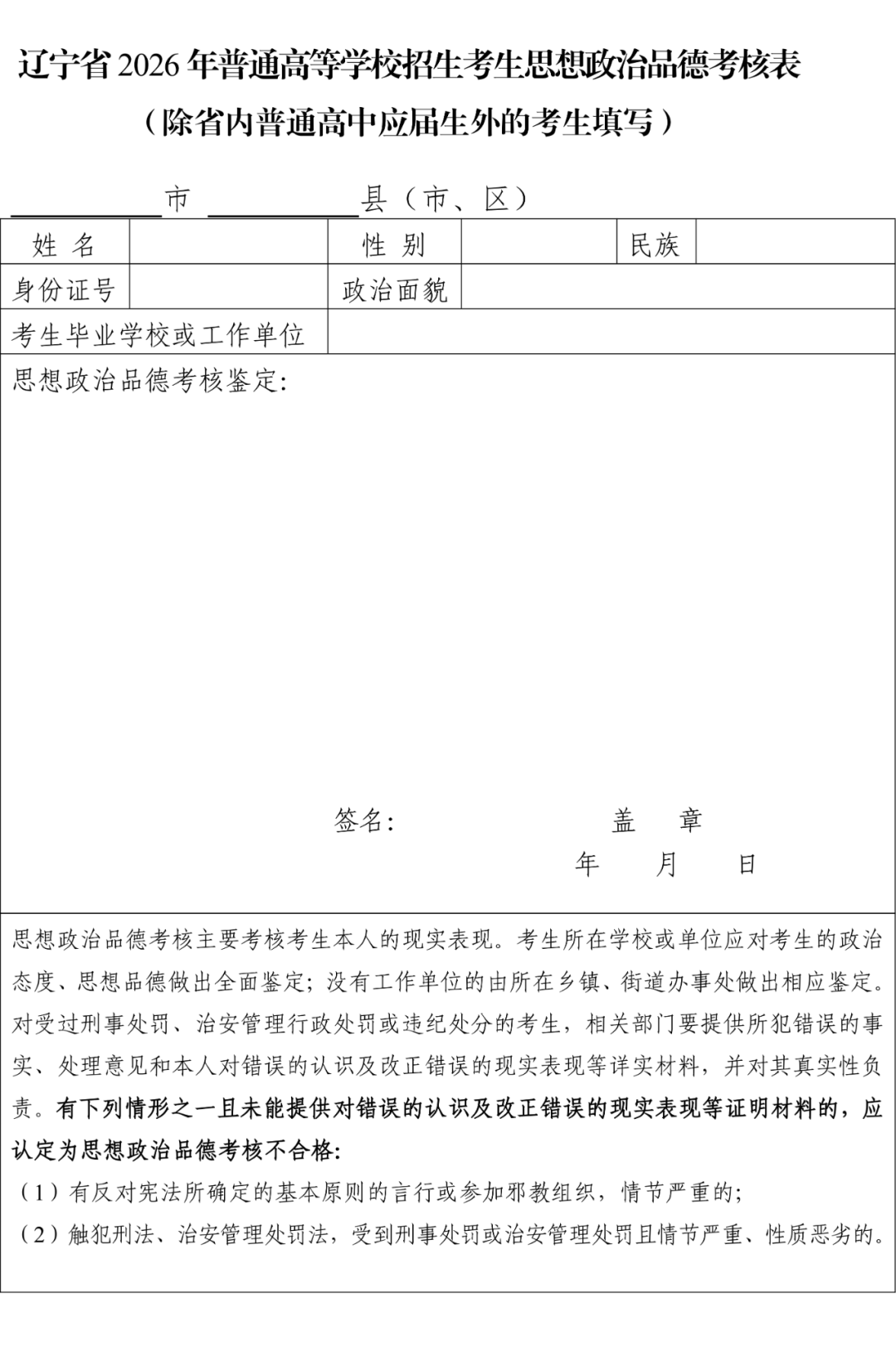 3.《2026年辽宁省普通高等学校招生考生思想品德考核表》(除省内普通高中应届考生外的全部考生)。