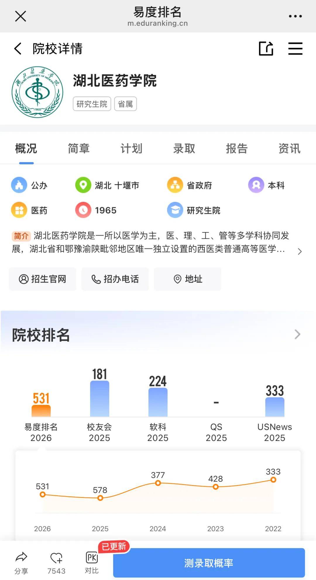 3、例如,想知道湖北医药学院的排名,可在搜索栏中输入学校名称,即可得到2026年最新排名,下方还有历年排名可参考哦~